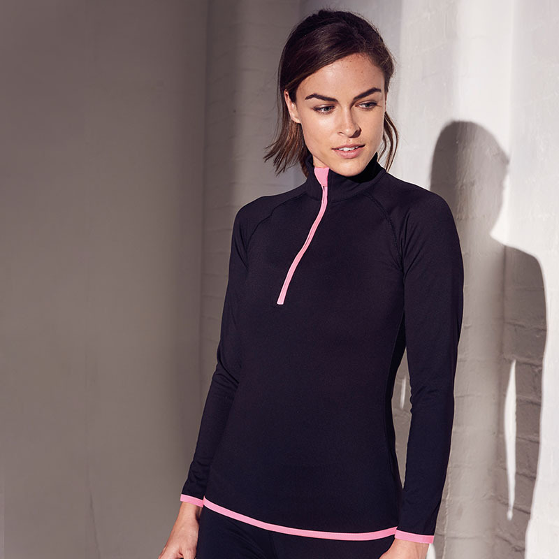 AWDis' own CoolFit blended fabric containing elastane that provides stretch for comfort and a great fit, girlie fit, reflective tab at back of neck helps keep ear phone cords in place, self-fabric contrast colour binding at zip, cuffs and hem, raglan sleeve design creates ease of movement, 1/2 zip with stand-up collar for warmth, chin guard prevents irritation, simple tear off label makes it perfect for rebranding, UPF 30+ UV protection. Washing Instructions Wash at 30°c, Do not use bleach, Do not tumble dry, Do not iron, Do not dry clean