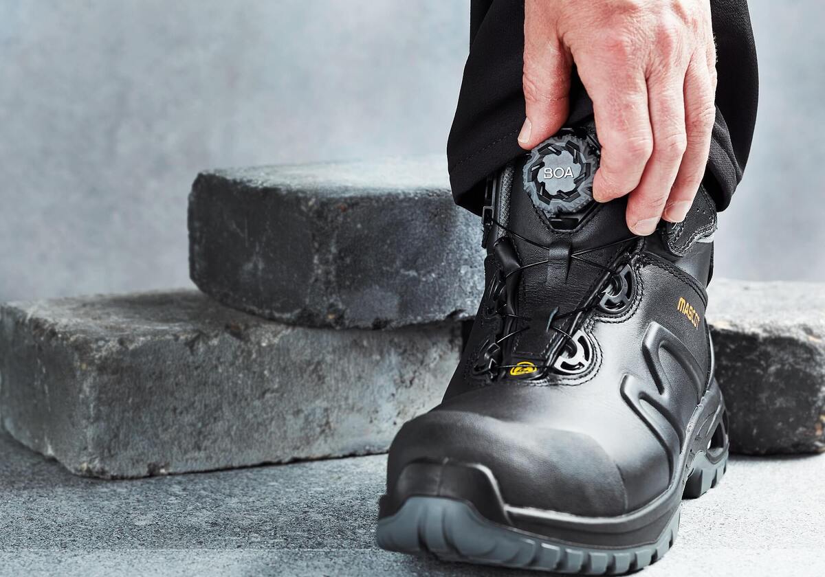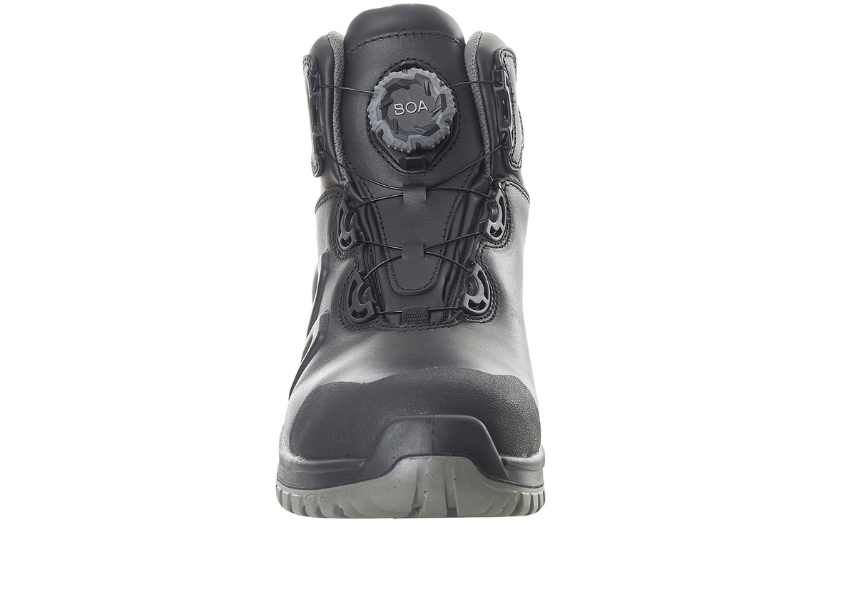 The front part of the shoe bends flexibly with the foot. Opens and fastens with BOA®, which consists of a rotational dial, laces and guides. Composite toe cap. MASCOLAYER® nail protection. Insert in the midsole of shock-absorbing lightweight material. Shock-absorbing, soft and flexible two-component sole of PU/PU. Durable non-marking outsole. TPU toe reinforcement. Bootleg in breathable high quality full grain leather. Heat resistant sole up to 140°C. Ladder grip. 5.0mm profile depth. Removable insoles with optimal arch support that can counteract the tendency to flat foot. Sole is oil and petrol resistant. ESD Approved to EN IEC 61340-4-3: 2002.