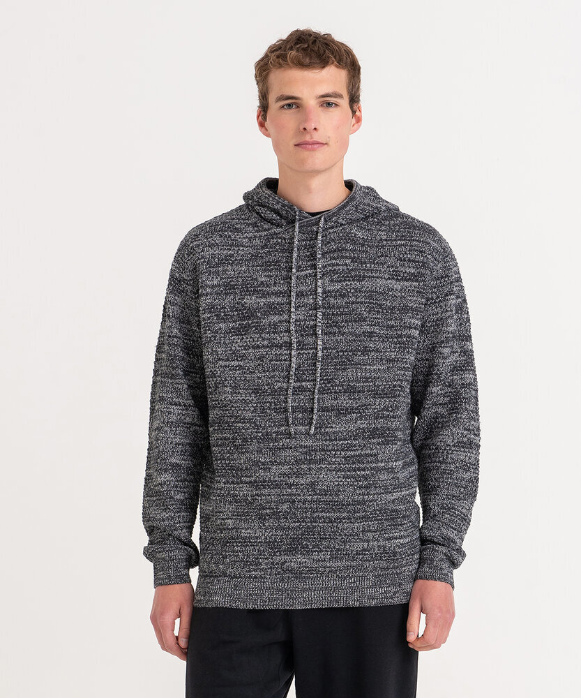 Chunky tuck stitch knitted hoodie made from regenerated yarn. Featured hood with drawcords, rib at cuffs and hem and two-tone yarn.