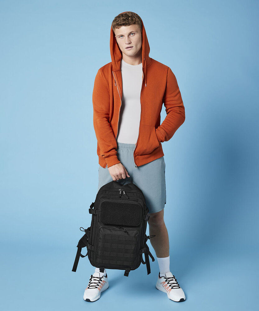 Military-inspired design. MOLLE webbing loop detail. Large main compartment. Padded laptop compartment, compatible up to 17". Full Rip-Strip™ front pocket for optimal decoration. Three large zipped front pockets. Dual tight-knit stretch mesh bottle pockets, capable of holding 750ml bottle shakers. Internal mesh pockets. Padded back panel. Large top carry handle. Compression straps. Ergonomically designed straps for everyday comfort. Fully adjustable chest strap. Compatible with Rip-Strip™ patches BG840 and BG841. Compatible with Modulr™ multi pockets BG241 and BG242. TearAway label for ease of rebranding.